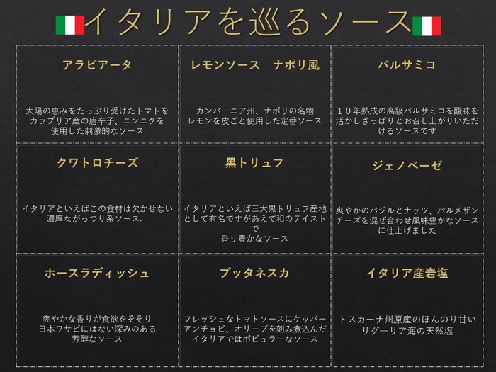 アラビアータ、レモンソース ナポリ風、バルサミコ、クワトロチーズ、黒トリュフ、ジェノベーゼ、ホースラディッシュ、プッタネスカ、イタリア産岩塩