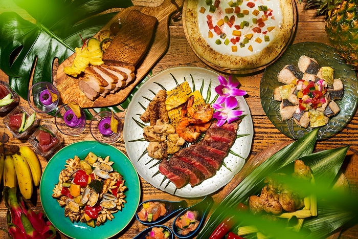 ホットメニューには”フリフリチキン風 鶏肉の甘辛タレ”や、ハワイ料理で頻繁に使われる魚「マヒマヒ」を使った”マヒマヒの香草マリネ オーブン焼き”、ハチミツやメイプルシロップを付けていただく”フルーツピッツア”など多彩なメニューをご用意。また、ハワイ料理でお馴染みの”ロコモコ”は、お好きな具材やソースを選んでお召し上がりください。