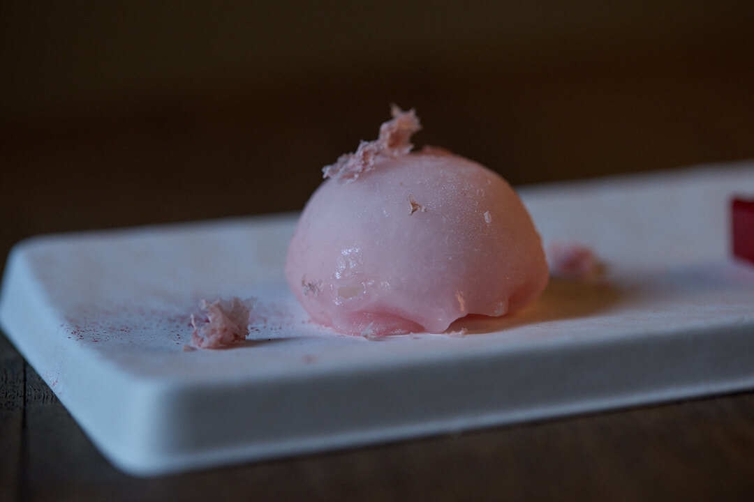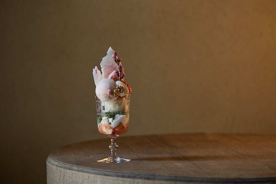 コースは全部で5品。まずは季節の色や香りでおもてなしとして桜ベリーソースが入った「桜クレあん(クレームダンジュ)」。2品目は濃厚なピスタチオシェケラートに相性の良い、爽やかな香りの「パート・ド・フリュイ赤紫蘇エイド」。3品目は旧和菓子店であることに敬意を表して「桜餅関東風」。4品目は、旧井筒屋でパフェをご提供することを想像して特別に誂えた「桜ジェラートパルフェ」。5品目の特性お汁粉は、旧井筒屋の名物だったお汁粉をイメージしてPATISSERIE ASAKO IWAYANAGIの隠れ名物、あんこを使用、最後に締めのお飲み物となります。