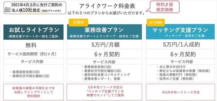本日から5月31日までの期間中、ご契約をいただいた先着10社様には、下記の特別限定価格にて「アライクワーク」の各種サービスを提供いたします。また、約1ヶ月間、『業務改善サービス』のうち一部サービスを無料でお試しいただける「お試しライトプラン」もご用意しております。