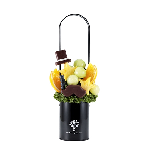 キュートなハットとポップな口ひげのアレンジメントは、どこにもない、プレジールのフルーツブーケオリジナルデザイン。