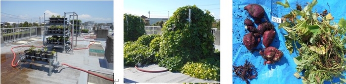なお、サツマイモの光合成効率は、三層栽培法により従来と比較して3倍に、下水処理水の連続供給によりさらに2倍(総合効率:6倍)高まりました。さらに、暖房用の燃料を用いる必要がなくなったため、11月~5月も栽培することが可能となり、これまで無駄になっていた日射エネルギーを利用することで、光合成効率がさらに1.6倍(総合効率:10倍)に高まりました。冬季栽培の温度管理など、栽培条件を改善すれば、さらに総合効率を12~15倍に高められることも示唆されました。