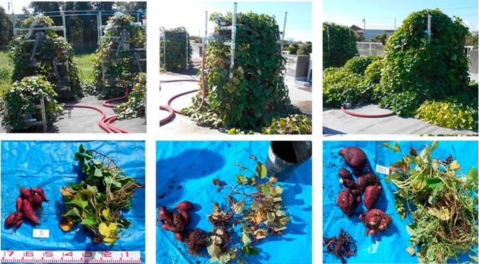 近畿大学生物理工学部の研究グループは、先行研究において、サツマイモの根圏※2 に酸素を含む灌漑水と液肥を供給する根圏水耕栽培法を用いることで、生産量が大幅に増大することを見出しました。さらに、日射を立体的に分散し光合成効率を高めるために、根圏灌漑多層(三層)栽培システムを開発し、合成肥料を希釈した灌漑水を根圏に供給して大量生産実験を行ったところ、全国平均の4倍に相当する10kg/m²の生産に成功しました。