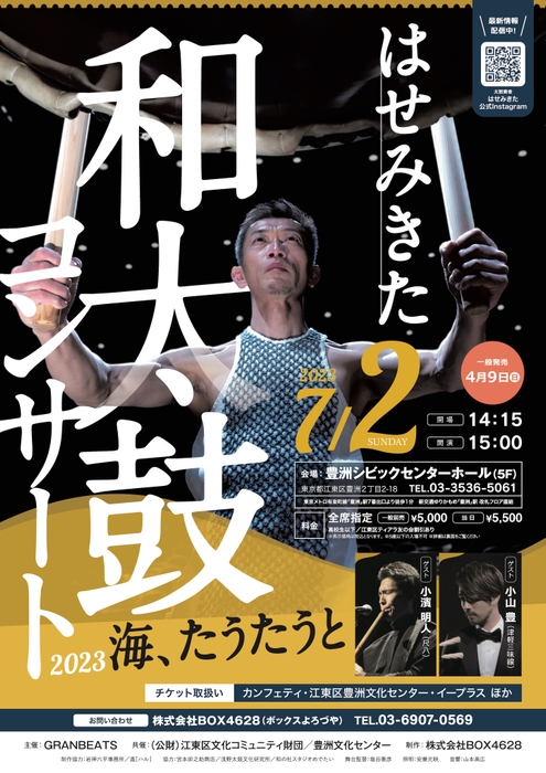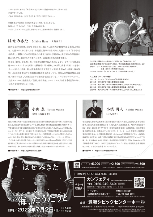 はせ みきた和太鼓コンサート2023『海、たうたうと』が2023年7月2日 (日)に豊洲シビックセンターホール(東京都江東区豊洲2-2-18豊洲シビックセンター5F)にて上演されます。