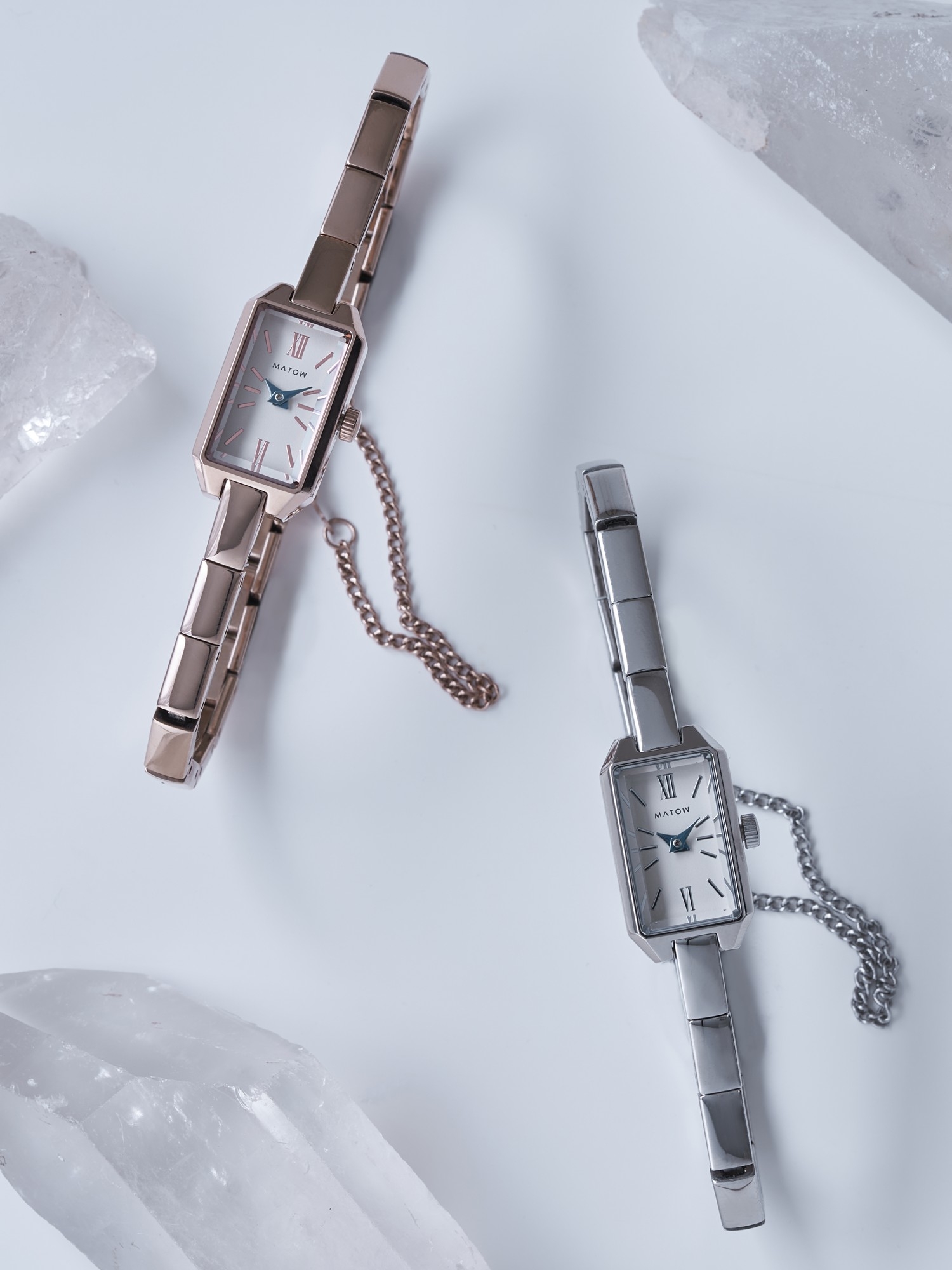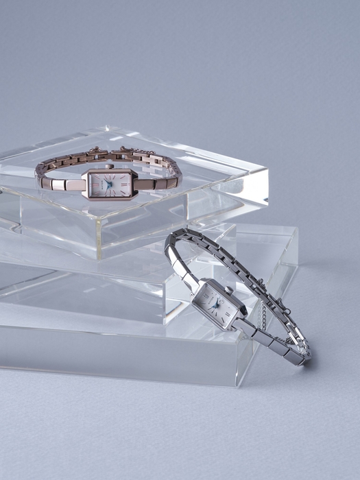 文字盤の繊細なインデックスは、月光が水面にそっと映るような柔らかな輝きを放ち、青針のアクセントが夜の静寂を思わせる深みを加えます。職人の手によって細部まで丁寧に仕上げられ、時代を超えて愛される一本となるように仕立てました。縦23mm×横13mmのコンパクトなレクタングルケースは、ローズゴールドとシルバーの2種類をラインナップ。それぞれケース同色のメタルベルトを備え、手首に馴染むように設計されています。さらに、バックル部分には細身のチェーンが付属し、ジュエリーのように楽しめる仕様に。シンプルながらも、手元に洗練された輝きを添えるデザインとなっています。