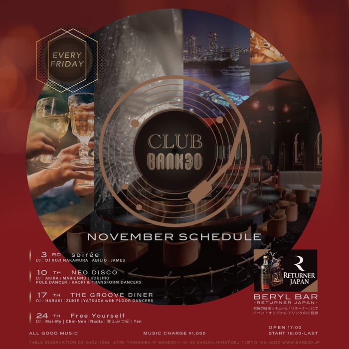 レストランと音楽の融合 エンターテインメントレストランを提案する「BANK30」が 11月毎週金曜日 新感覚のディナースタイルとして 「CLUB BANK30」の営業を展開