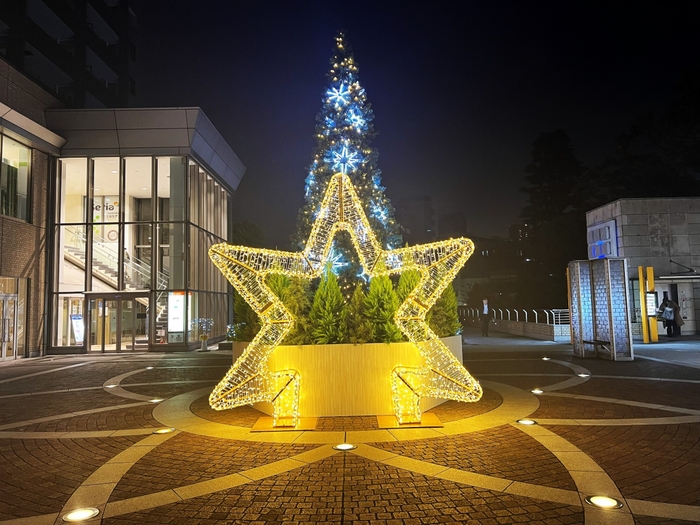アドレスプラザのメインツリーと連動したシャンパンゴールドのイルミネーションが輝く中、スターオーナメントのホワイトカラーが際立ちます。