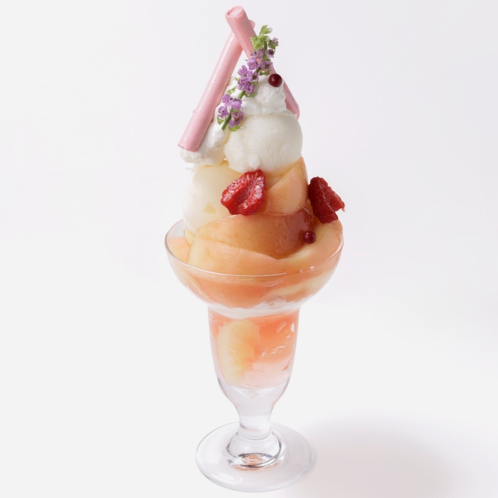桃と相性の良いヨーグルトを組み合わせたパフェ。ヨーグルトクリームとヨーグルトソルベ、桃ソルベ、桃ゼリーなどさっぱりとした味わいです。最後まで桃を一緒に食べれるように中にも桃がたっぷりと入っています。