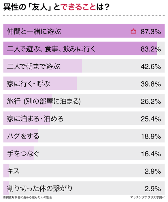 株式会社ネクストレベル(本社所在地:神奈川県横浜市、代表取締役:田中大洋)が運営するマッチングアプリ大学(https://jsbs2012.jp/)では、親しい異性の友人がいる・いた男女244名を対象に、異性間の友情に関してのアンケート調査を行いました。