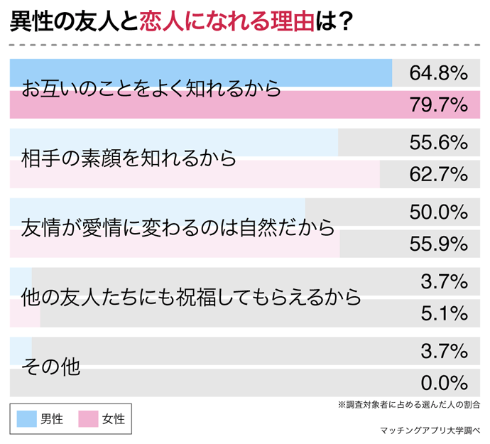 友人から恋人になれる理由としてもっとも多かったのは「友人としての付き合いの中で、お互いのことをよく知れるから」で、男女あわせると7割以上の人が回答しました。