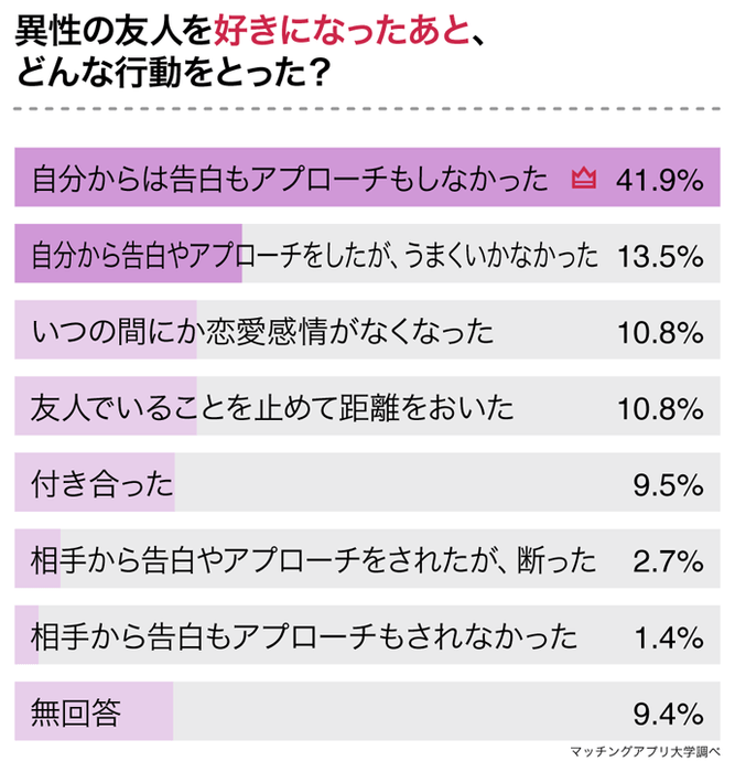 異性の友人を自分から好きになった場合の行動として、もっとも多かったのは「自分からは告白もアプローチもしなかった」で41.9%でした。次に多いのは「自分から告白やアプローチをしたが、うまくいかなかった」で13.5%ですが、アプローチしなかった人との差は28.4%で、自らアプローチすることの難しさが表れています。