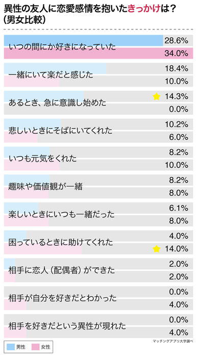男女で順位に大きな差があったのは「あるとき、急に意識し始めた」で、男性が14.3%に対し女性は0%でした。「宿泊したときに普段とは違う面をみて意識するようになった。(30歳男性・愛知)」「距離が離れた頃から意識し始めた。(29歳男性・福岡)」「男友達がその友人を魅力的だと言っていたので、異性として興味をもった(32歳男性・兵庫)」のような声もあることから、男性に関しては今まで友人だと思っていた相手が急に女性に見えてくる瞬間があるようです。