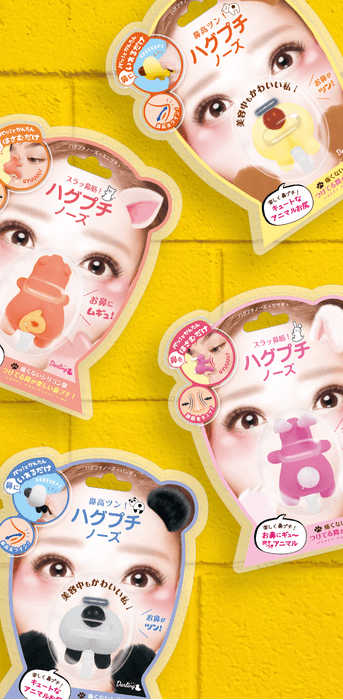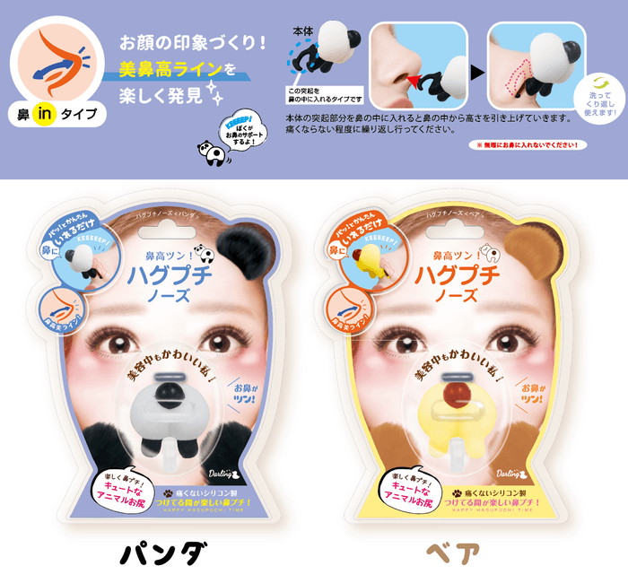 鼻の中にいれて鼻をツンっと見せる「パンダ」「ベア」、鼻に被せて鼻筋をスラッと小鼻に見せる「ウサギ」「ミニブタ」の4種類の動物が、まるでお鼻に抱きついちゃったように見える、かわいくてついつい笑っちゃうおもしろグッズです。