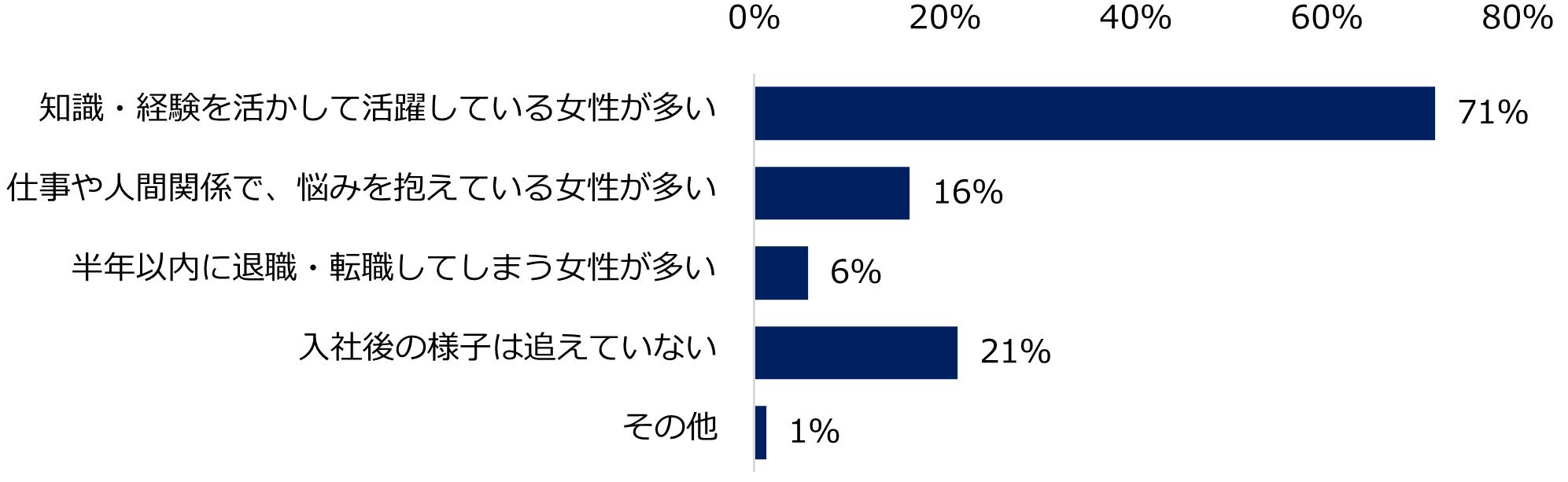 経験を活かして活躍している方が多い一方で、男性社員のマネジメントで壁があり、悩みを抱えている方もいる。特に中堅企業では自身より年齢の高い男性部下をもつケースもあり、早期退職するケースがある。