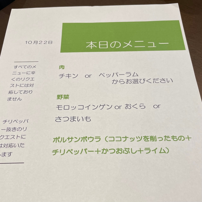 家庭によって全く違うスリランカの国民食カレー。店主山口さんのお母様はスリランカの西部コロンビアにいらっしゃいます。お母様のカレーにほれ込んだ山口さんは毎年、スリランカに伺ってはお母さまから味を伝授。この度、スリランカ出身のご主人のお墨付きも得られて間借り開業することとなりました。