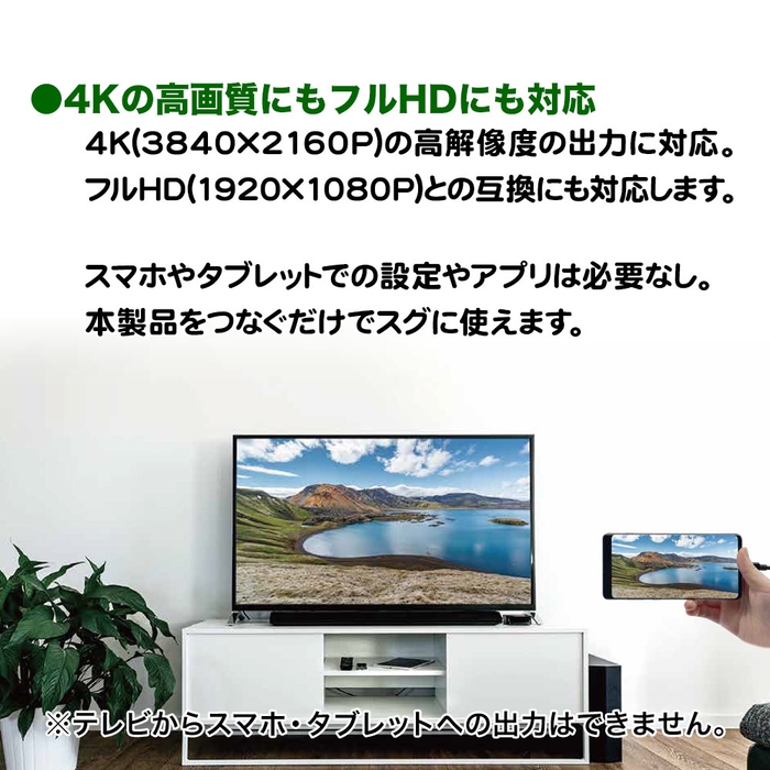 コネクタ形状:USB Type-Cオス(スマホType-C端子へ) HDMIオス(テレビHDMI入力端子へ)