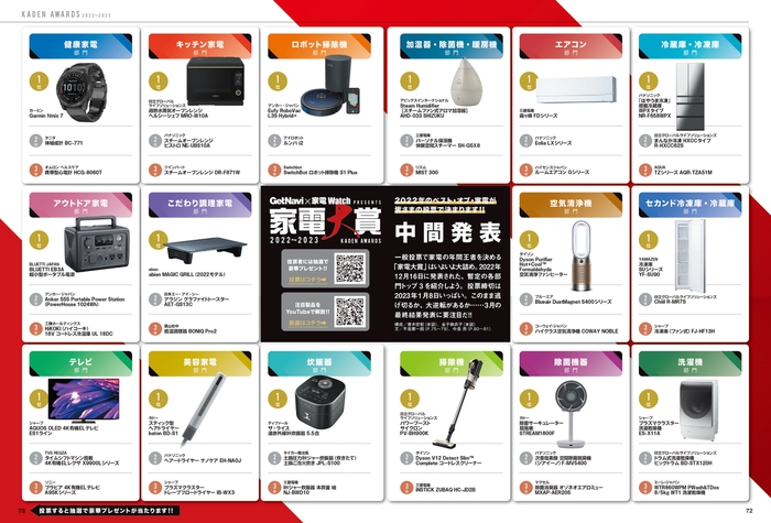 白物家電専門サイト「家電 Watch」とのコラボ企画、一般投票で家電の年間王者を決める「家電大賞」はいよいよ大詰め。今回は、投票の途中経過をお知らせします。現在のトップがこのまま逃げ切るか、大逆転があるのか……3月の最終結果発表まで目が離せません!