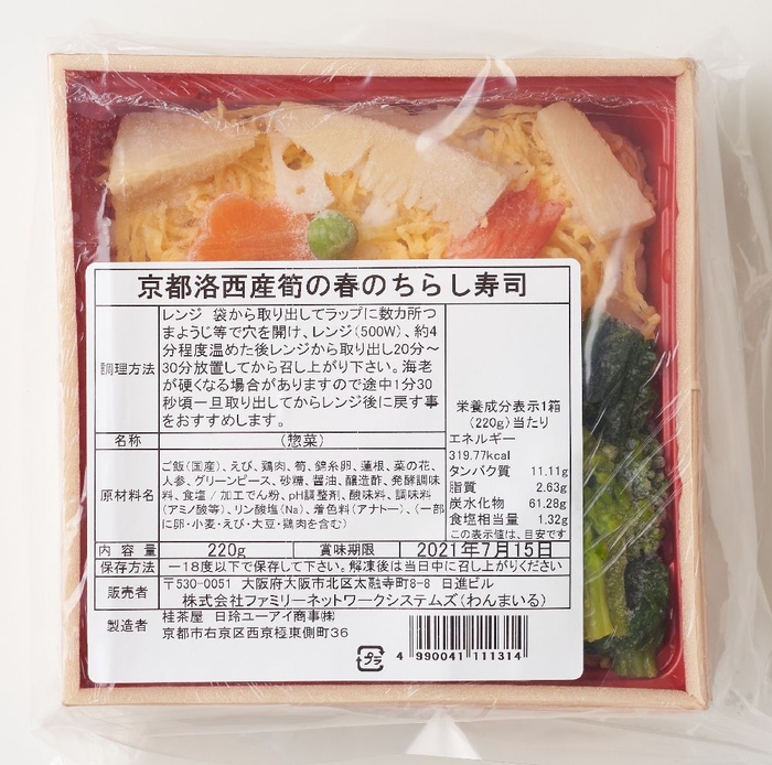 季節ごとに旬の食材を入れたちらし寿司はわんまいるの人気商品で、春は京都洛西産のたけのこをはじめ、菜の花、海老、蓮根、花にんじん、錦糸玉子を華やかにちりばめてあります。酢飯の間には甘辛く味付けした鶏そぼろを敷き詰めたちらし寿司です。酢飯の酸味と鶏そぼろの甘味が絶妙にマッチしています。お祝いの時や急なお客様の対応などにも便利です。