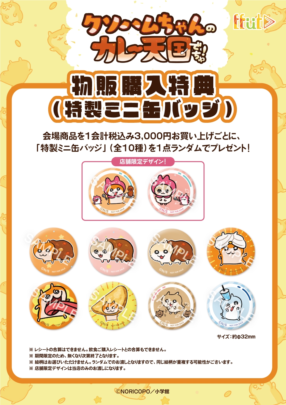 物販1会計、税込み3,000円お買い上げごとに 「特製ミニ缶バッジ」(全10種)をランダムで1点プレゼント!
