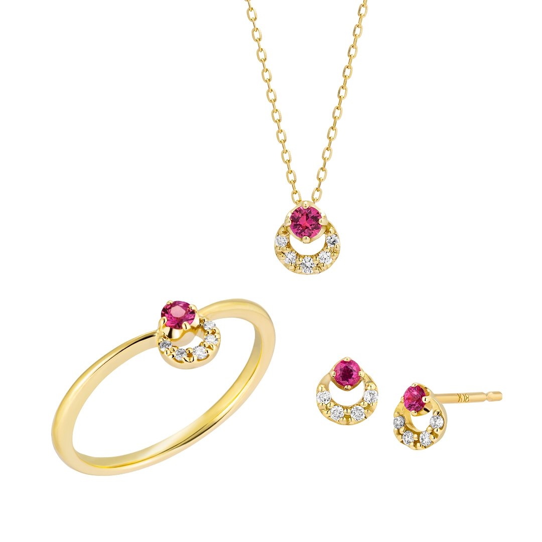 美しく燃え上がる炎のように輝く色から、情熱的な愛をもたらすとされるルビー。“情熱”“愛”“自由”といった石言葉を持つルビーの魅力が、より広がっていくようなイメージで周りにダイヤモンドをあしらい、光の輪を表現しました。幅広いシーンで使いやすい小ぶりなサイズで、オンオフを問わず活躍します。シンプルでさりげないデザインは、カラーストーンジュエリーが初めての方にもぴったり。ルビーは7月の誕生石でもあり、7月生まれの方の誕生石ジュエリーとしてもおすすめです。