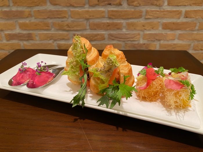 リコッタチーズとトマトのクロワッサンサンドイッチ、カニとリンゴのタルタル仕立て、マンゴーのカダイフロースト生ハムを添えて