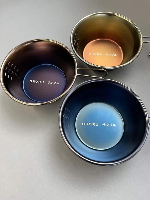 “業界唯一”特許技術「ORORU(R)処理」で彩られるステンレス製品、世界で唯一の色調均一化したステレンス発色技術である「ORORU(R)処理」により、ステンレスのシェラカップに発色加工しました。これまでにない色彩のシェラカップはキャンプやアウトドアで目立つこと間違いなし、カラーはブルー・ブラウン・イエローとなり、名入れも可能です。角度によって色味が違ってみえるのは、光の反射、屈折による干渉作用を使い、ステンレス表面に色を発色する技術を使用しているからです。そのため光の当たり方(強さ、角度など)により、さまざまな色彩変化が表現されるので使用する場面ごとに、その空間は彩られ、いつもよりワンランク上の雰囲気を醸し出してくれます。