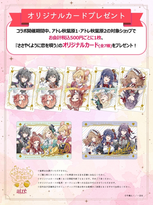 コラボ開催期間中、アトレ秋葉原1・アトレ秋葉原2の対象ショップでお会計税込500円ごとに1枚、『ささやくように恋を唄う』のオリジナルカード(全7種)をプレゼントいたします!