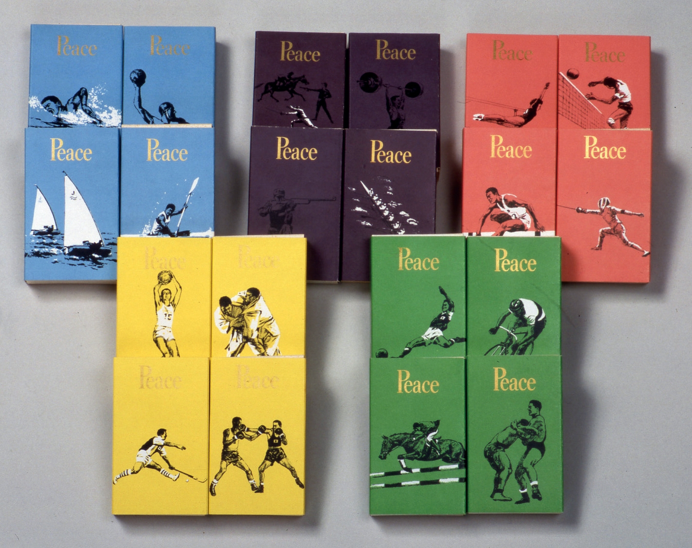 *五輪カラーに合わせた5色で、全競技20種目をデザインした「ピース」をセットにして発売された記念たばこ。