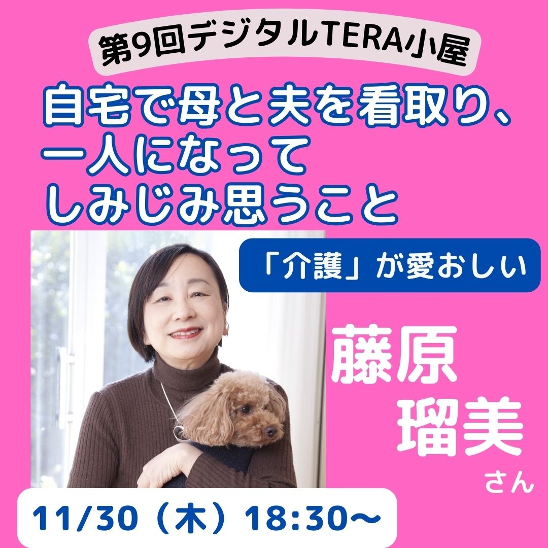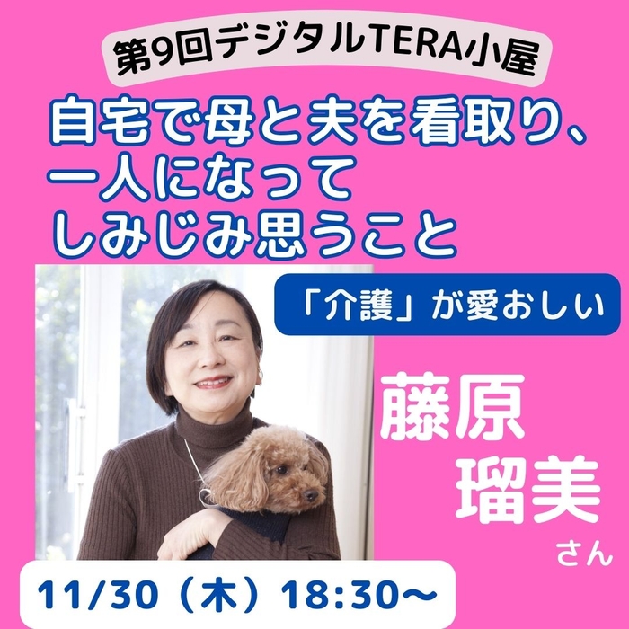 「介護って、何することなのか分からない」「大切な人の最期、寄り添いたいけど?仕事を離れて介護に専念なんて無理」「少子高齢化、人手不足。自分の老後は、誰が介護してくれる」…「介護」という言葉には、どの世代にも様々な想いがあります。一人で考えるには少し重いテーマでもあります。藤原さんの、長年の介護経験や人生観に触れ、「介護と看取り」についてご参加の皆さんと一緒に考えてみませんか?