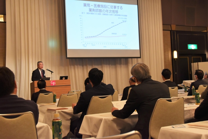 黒野教授の講演タイトルは「薬とDXで考える人と組織の未来―シミュレーション教育と広報改革の視点から」で、薬剤師を取り巻く状況や求められる資質、本学薬学部で行っているシミュレーション教育について紹介しました。