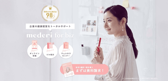 「mederi for biz」は、現役産婦人科医によるオンライン診療、ピルの処方、ウェルネスセミナーなど女性の健康課題をサポートするサービスです。