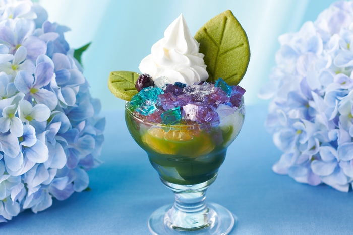 紫陽花パフェのセットメニューとして、もっちりしたういろう生地に宇治抹茶を練り込み、小豆をのせて蒸し上げた、爽やかに宇治抹茶が香る新作「お抹茶の水無月」を添えた「紫陽花茶会」が登場いたします。2024年6月中旬~6月下旬限定で提供予定です。