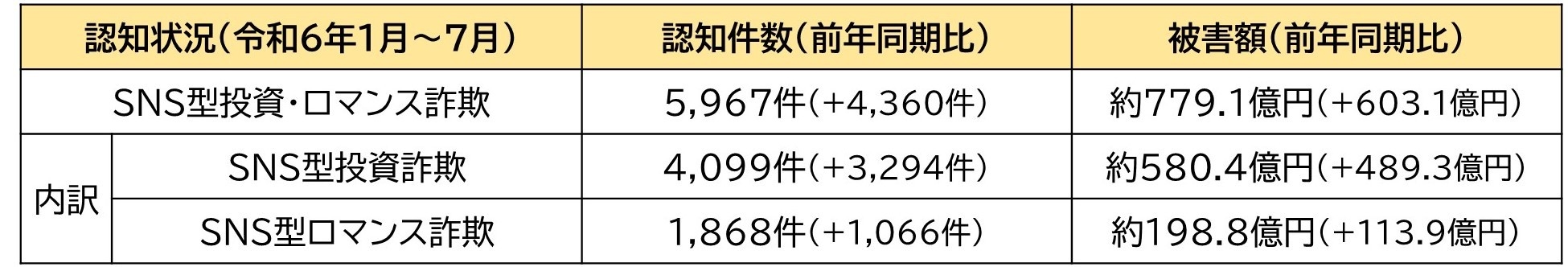警察庁が9月3日に発表した「令和6年7月末におけるSNS型投資・ロマンス詐欺の認知・検挙状況等について」によると、SNS型投資詐欺・ロマンス詐欺の認知件数および被害額が、前年同期に比べて大幅に増加している状況です。