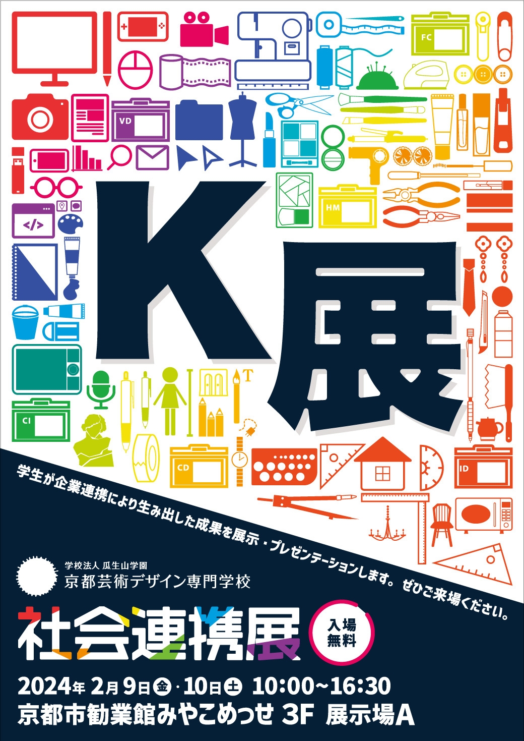 「K展」は、「学校法人瓜生山学園 京都芸術デザイン専門学校」が主催する社会連携展です。学生が企業連携によって生み出した課題の成果を展示・プレゼンテーションするイベントで、学校として社会から評価を受ける場となります。本展では、学生たちがチーム単位でプロジェクトに参加しながら企業および行政や団体と連携し、社会課題やビジネスニーズに対応する解決策を提案しています。