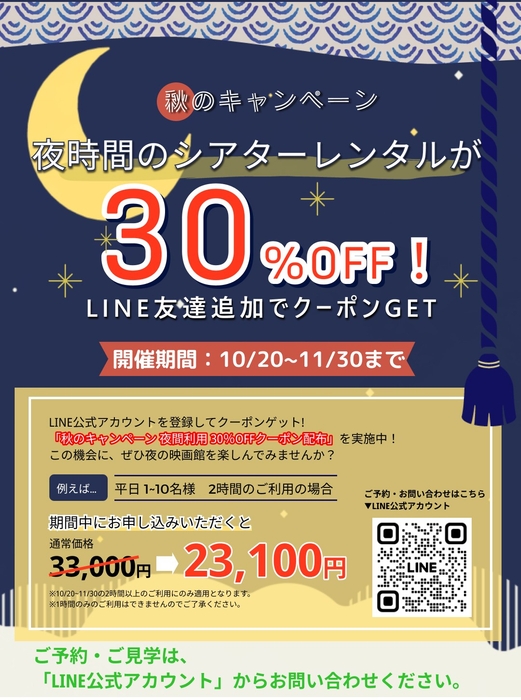 本キャンペーンは、秋の夜長を楽しむお客様に向けた特別企画です。夜間のご利用に限り、通常料金から30%もの大幅割引を適用いたします。