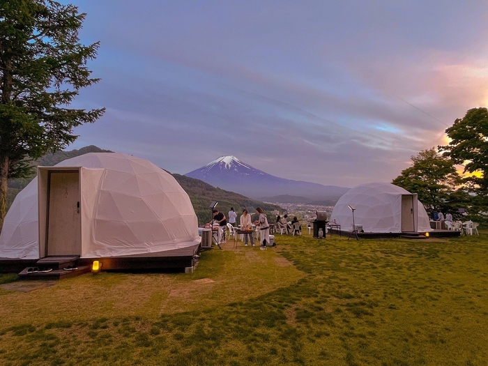 ・宿泊は「杓子山ゲートウェイキャンプ」の2022年に新設されたドームテント「グランスイート-ラグジュアリー」(最大4名様宿泊可)、「グランスイート-デラックス」(最大2名様宿泊可)からお選びいただけます。眺望抜群の新設の露天風呂「天空の湯」、現在建設中のアウトドアサウナがツアー貸切となります。