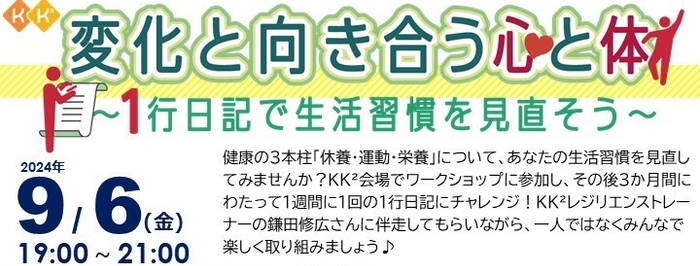 健康の3本柱を支える心の柱「心柱(しんばしら)」に注目するユニークなプログラムです。KK²会場でワークショップを開催し、その後3か月間にわたって1週間に一行日記にチャレンジしていただきます。3か月後にはオンラインで報告会を開催!KK²レジリエンストレーナーの鎌田修広さんに伴走してもらいながら、一人ではなくみんなで楽しく取り組みましょう。