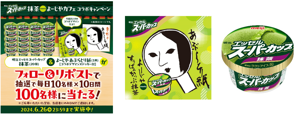 コラボメニューの発売を記念して、6月17日(月)より『よーじやカフェコラボ 毎日当たるキャンペーン』を実施します。10日間、抽選で毎日10名様に「明治 エッセル スーパーカップ 抹茶」20個と、よーじや あぶらとり紙 1冊(コラボデザインステッカー付)が当たります。