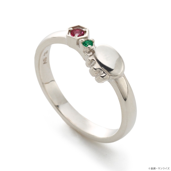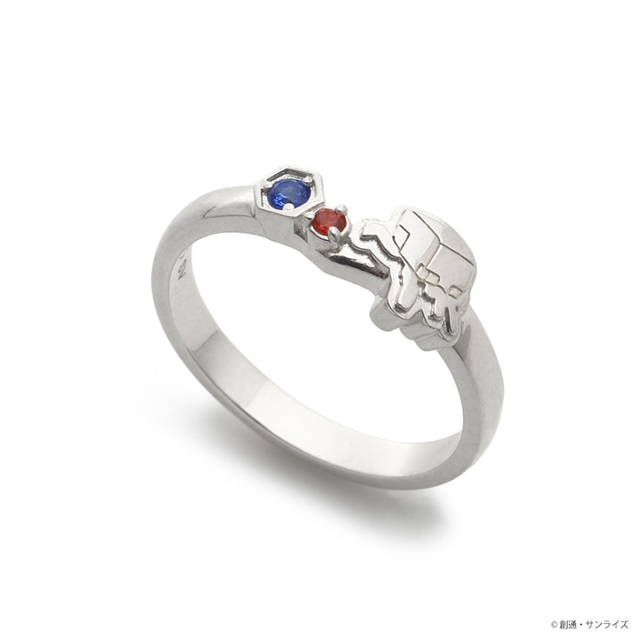 『機動戦士Gundam GQuuuuuuX』のシャリア・ブルをイメージしたシルバーリングです。中佐の胸章をモチーフに取り込んだゆるやかなV字ラインのデザインにイメージカラーストーンを2石セットしました。