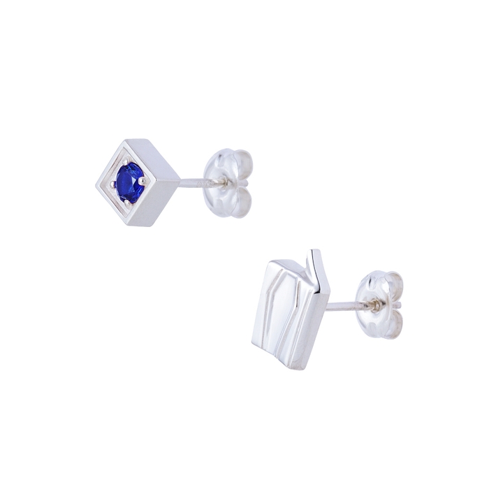 片方は手帳のモチーフ、もう一方はスクエア型の台座にイメージカラーストーンをセットしたアシンメトリーなデザイン。