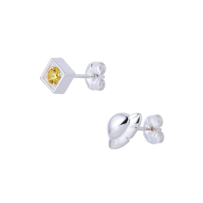 片方は髪飾りのモチーフ、もう一方はスクエア型の台座にイメージカラーストーンをセットしたアシンメトリーなデザイン。