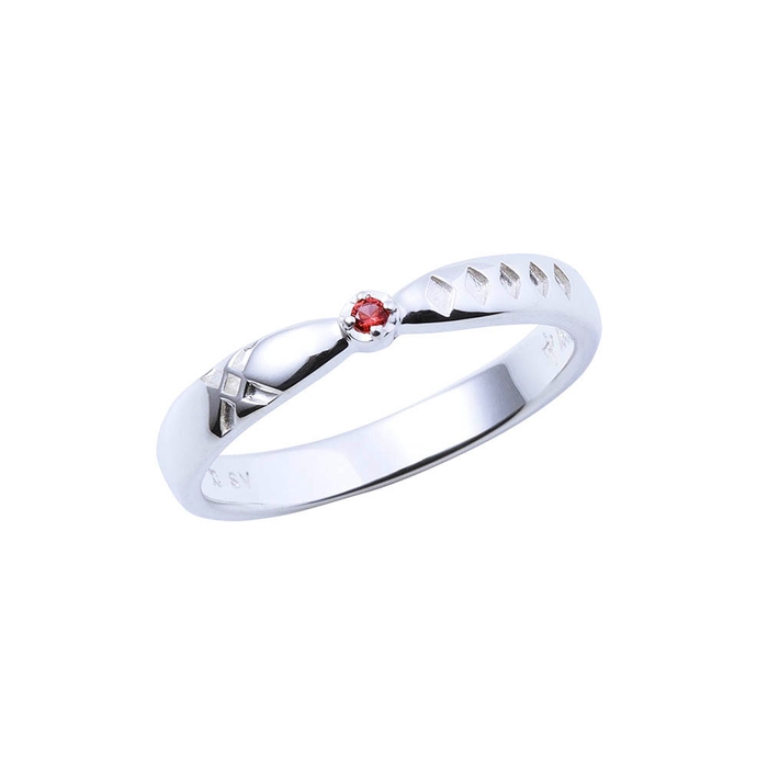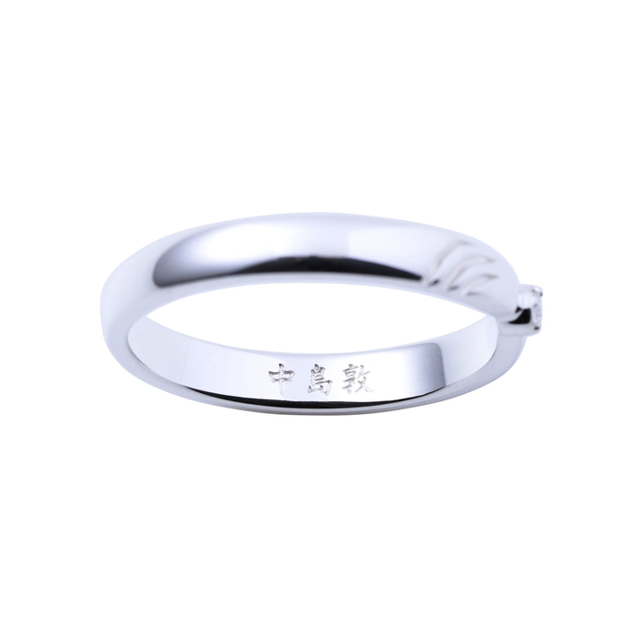 甲丸のストレートタイプのリングに、体に巻かれている包帯をモチーフとして取り込み、イメージカラーストーンをセット。内側には名前を刻印しました。