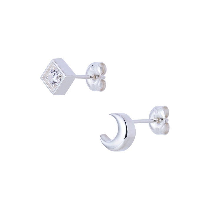 片方は月のモチーフ、もう一方はスクエア型の台座にイメージカラーストーンをセットしたアシンメトリーなデザイン。