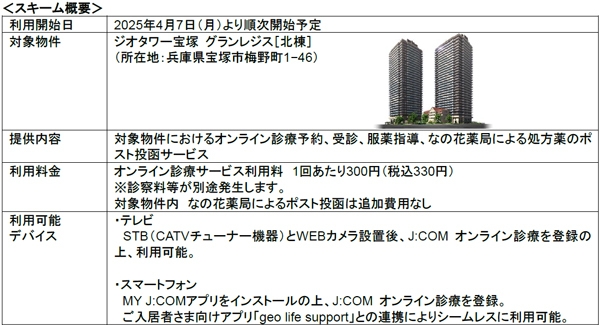 JCOM株式会社(J:COM、本社:東京都千代田区、代表取締役社長:岩木 陽一)と、阪急阪神不動産株式会社(阪急阪神不動産、本社:大阪市北区、代表取締役社長:福井 康樹)と、株式会社なの花西日本(なの花西日本、本社:大阪府豊中市、代表取締役社長:宇野 光裕)が展開する地域薬局「なの花薬局」は、医療にアクセスしやすい、安心な暮らしの提供を目指して、2025年1月に竣工した分譲マンション「ジオタワー宝塚 グランレジス[北棟]」(以下「対象物件」、所在地:兵庫県宝塚市)において、「J:COM オンライン診療」の利用から薬の受け取りまでマンション内で完結するスキーム(以下「本スキーム」)を提供します。