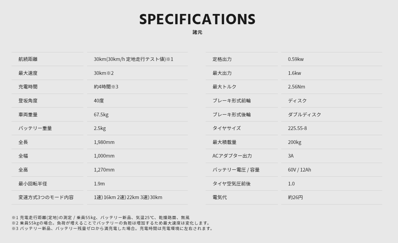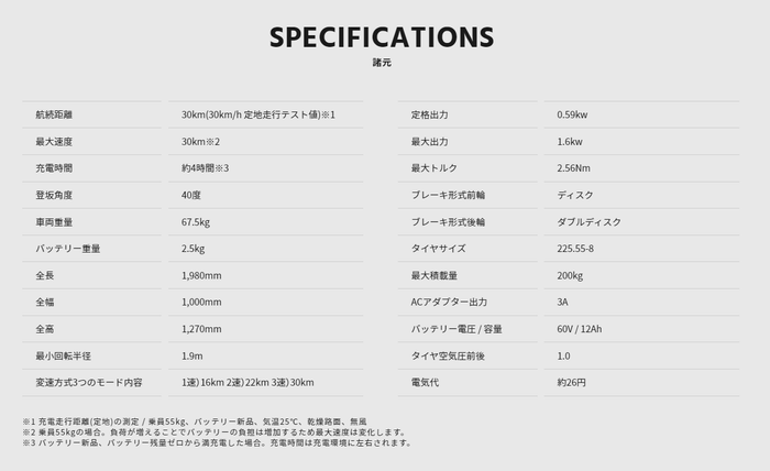 オプションの大容量バッテリーを使えば、約60kmの走行が可能で、その際の充電に掛かる電気代は約65円です!