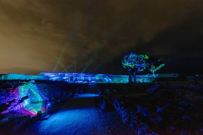 中城城跡で最も広く、主殿が存在した一の郭では、神秘的な光と音、自然が調和し、ファンタジーな世界観を演出します。オーロラのような優しく美しい光が、あなたを包み込み、癒しを与えることでしょう。