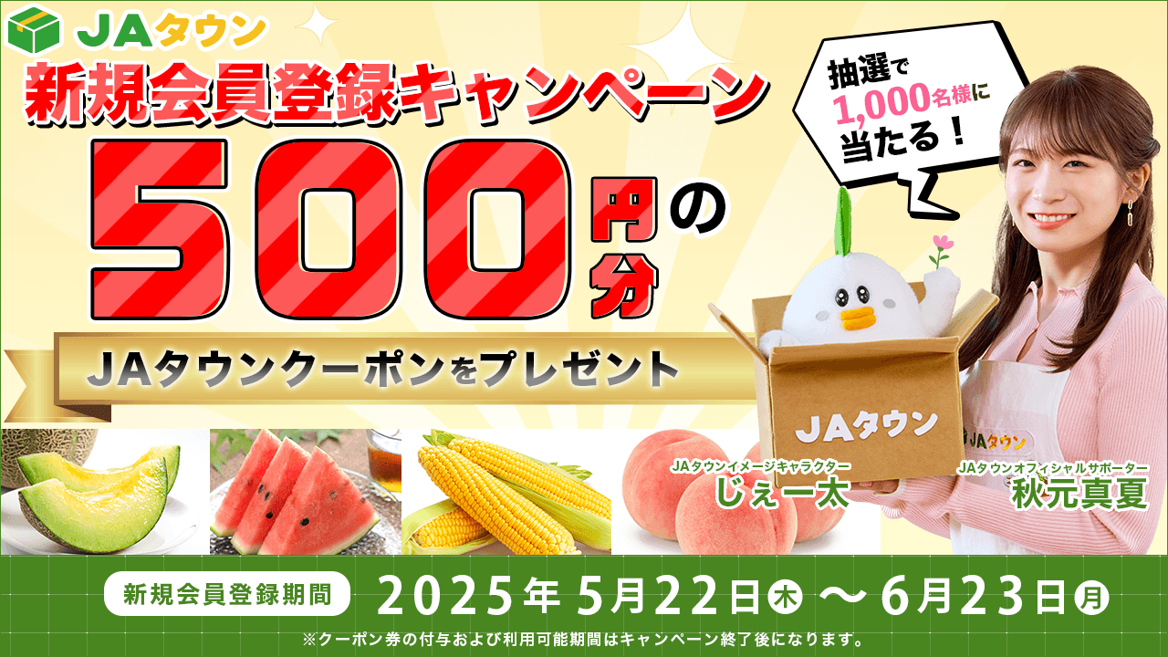 このキャンペーンでは、期間中に新規会員登録いただいた方の中から抽選で1,000名様にJAタウンのお買い物で使用できる500円分のクーポン券をプレゼントします。