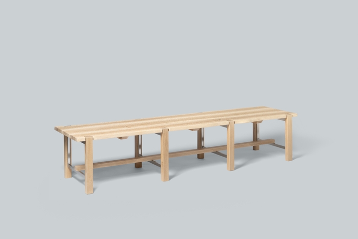 東川町に生えていた樹齢200年を超えるミズナラの木でつくったベンチです。木工の町東川町をあらわす家具となるよう、高い木工技術を表現するために蟻桟という木組を使い、この仕口がベンチの一番の特徴となっています。丸い脚と緩やかな曲線の座面、そして蟻組は日本の社寺建築の雰囲気を醸し出します。海外から多くの観光客が訪れる、日本の玄関口である東京トーチパークにふさわしいベンチとなるよう、日本文化を感じられるデザインとしました。