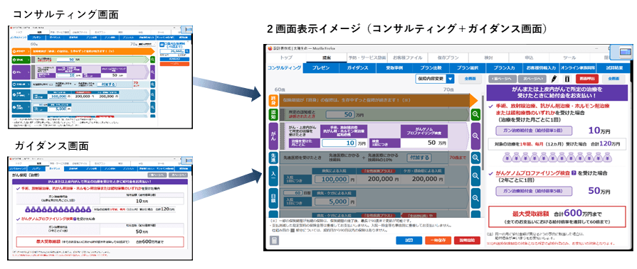 そこで「T-AI-Face」向けのリニューアル開発では、全画面表示に加えて2つの画面を同時に表示するUI改修を行いました。これにより、保障の全体像を表示する「コンサルティング」画面と、各保険の具体的な保障内容を説明する「ガイダンス」ほか3つの画面を提案シーンに応じて組み合わせることが可能になり、利便性や情報の一覧性を高めることで提案力の向上を図っています。