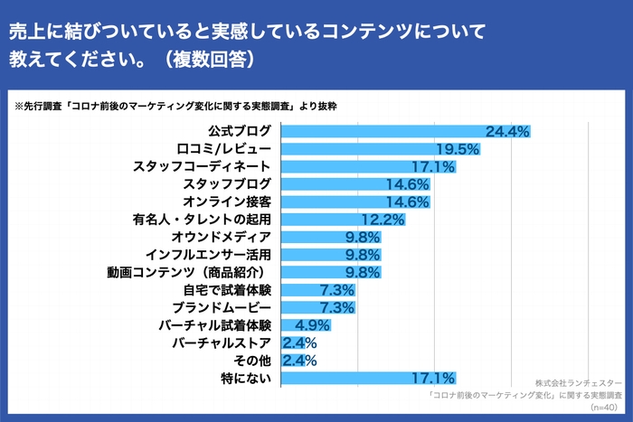 アパレル企業担当者への先行調査で、 「売上に結びついていると実感しているコンテンツについて教えてください。(複数回答)」(n=4)と質問に対し、「公式ブログ」が24.4%で最多となり、「スタッフコーディネート」は17.1%という結果に。